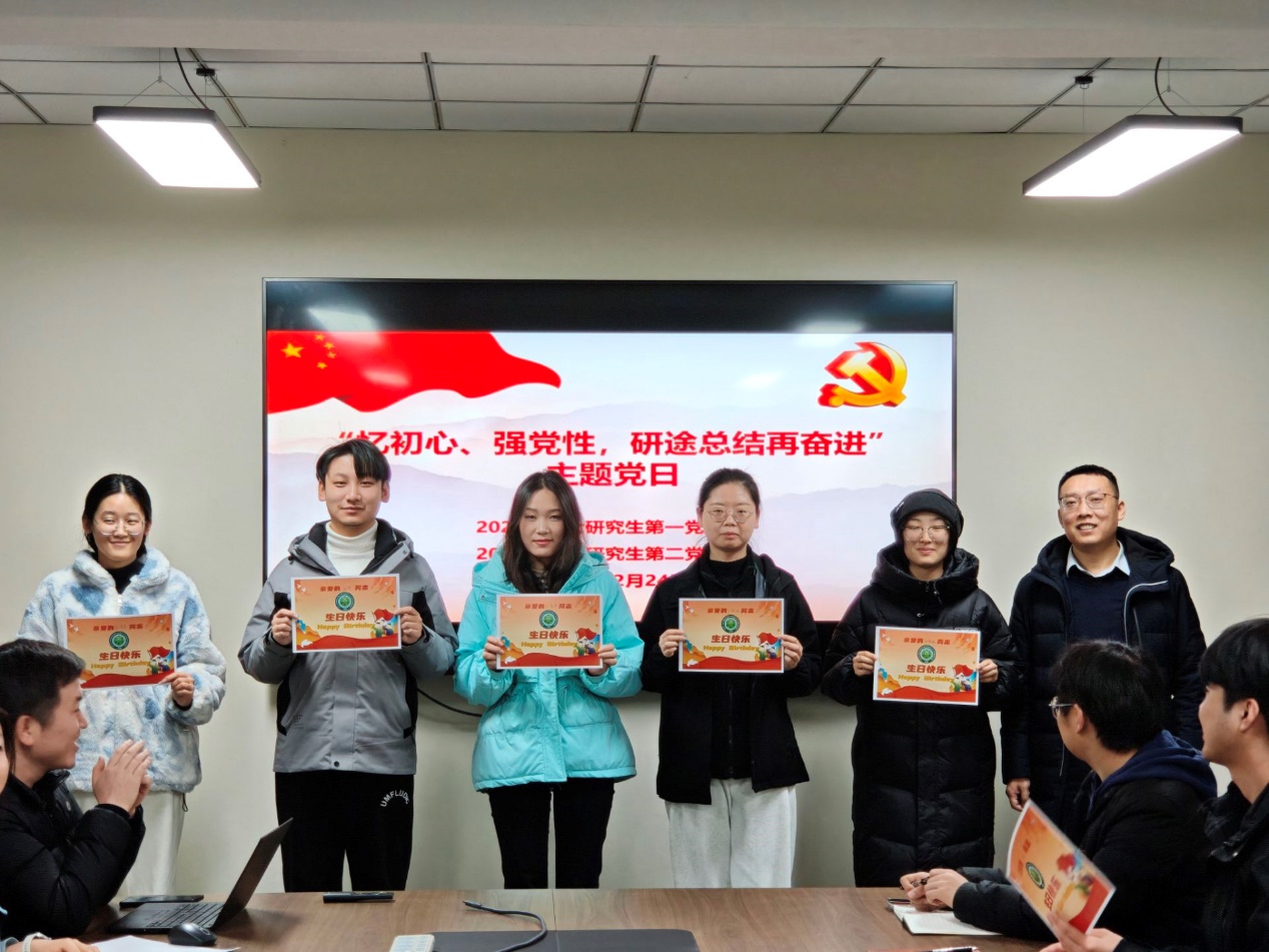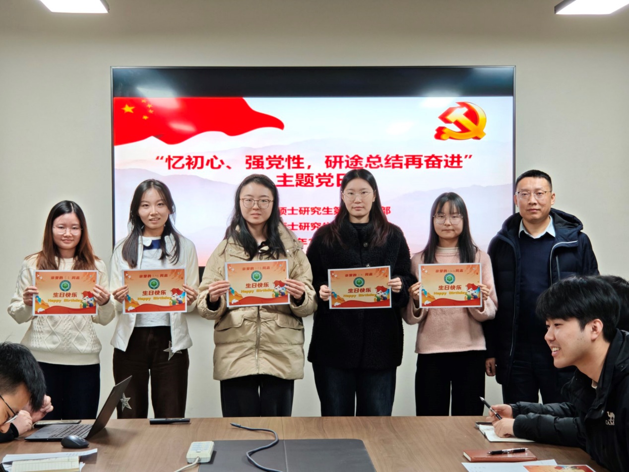 与会党员围绕个人的思想、学习、工作和生活情况,逐一分享了2025年度取得成绩和存在不足。会议为20名研究生党员赠送了“政治生日”贺卡。与会党员面向党旗,重温了入党誓词。
