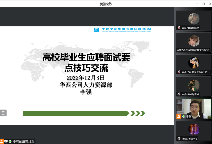 安全工程系依托西部安全工程虚拟教研室,与学校安全协会联合举办“安全工程学术沙龙”第四期讲座。本次沙龙由安全工程系副主任赵鹏翔主持。中建安装华西公司人力资源部副部长李强受邀就高校毕业生应聘面试要点技巧交流对海角网