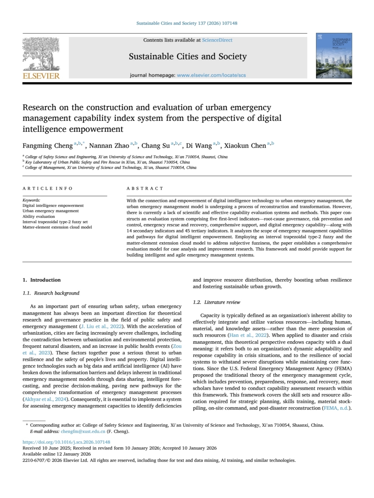 城市安全与智慧应急研究所程方明教授课题组在城市可持续发展领域顶级期刊《SustainableCitiesandSociety》(中科院一区TOP期刊,影响因子12.0),发表了题为“Research on the construction and evaluation of urban emergency management capability index system from the perspective of digital intelligence empowerment”的研究成果。论文第一作者及通讯作者为海角网