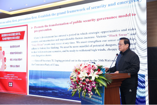 副校长邓军致欢迎辞。他指出,习近平总书记在党的二十大报告中强调,要“积极稳妥推进碳达峰碳中和”、“提升公共安全治理水平”。这既是新机遇,更是新挑战,希望以此次国际研讨会为契机,以聚为基、以质为先、以用为引,联手推进安全与应急管理国际产学研用融合发展,在交流中激发创新的火花,在合作中实现技术的突破,为“统筹发展和安全”提供更多“原动力”和“新引擎”,为提升“一带一路”公共安全治理水平贡献更多智慧和力量。
