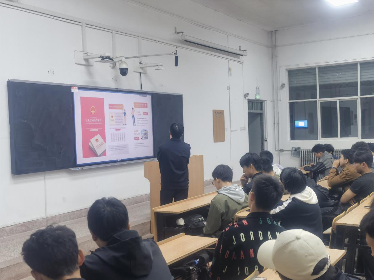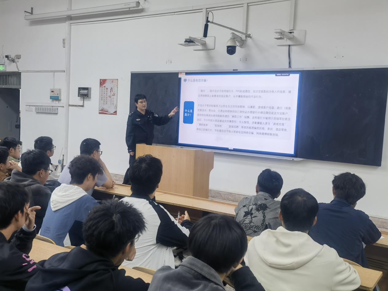 宣讲中,公安民警系统介绍了当前电信网络诈骗的主要类型、作案手法及识别技巧,重点剖析了刷单诈骗、代办信用卡诈骗、冒充公检法诈骗、游戏账号交易诈骗等十一类常见诈骗形式。结合大学生日常学习生活场景,通过真实案例再现诈骗过程,深入浅出地揭示诈骗背后的心理操控手段,提醒同学们要牢固树立“不听、不信、不转账”的防范意识。同时,警官还从“全方位安全防护”出发,就防火、防盗、防人身伤害三个维度对同学们进行安全提醒,强调了消防安全“预防为主、防消结合”的重要性,讲解了宿舍、教室等场所的防盗要点,并就人际交往、自我保护等实际问题提供了具体建议,帮助新生全面增强安全防范意识。