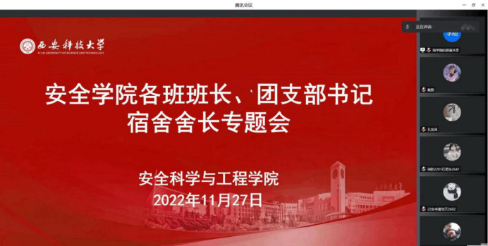 刘文刚对同学们近期在全员核酸检测、每日健康打卡、维护安全稳定等方面取得的成绩给予了充分肯定,传达学习了全省高校疫情防控调度会和学校有关会议精神,希望同学们在疫情防控的关键时刻,保持清醒头脑,充分认识当前疫情防控工作的严峻形势;严格落实个人防护措施和校园封闭管理、全员核酸检测、每日健康打卡、外出请销假等制度,从严、从细做好校园疫情防控工作;牢固树立安全意识,认真做好用电安全、饮食安全、交通安全、物品安全、网络安全等工作,守护好校园安全稳定。