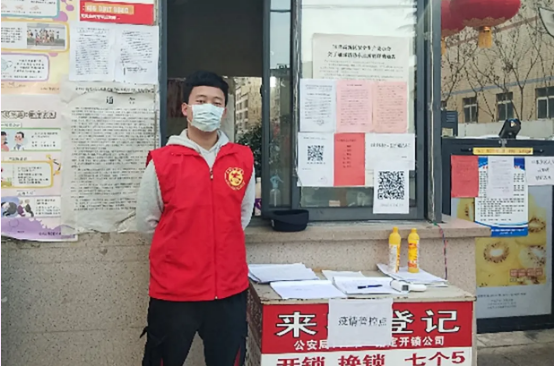 【他说】 :作为入党积极分子。在班里时刻提醒同学做好科学防控工作。在家响应号召到社区报到,努力当好疫情防控的“战斗员”,义不容辞主动投入一线,这是一件非常让我值得骄傲的事情。我相信只要红马甲在岗位多坚守一天,小区住户的信心就多增加一分,健康就增加一分,认真做好防疫工作,胜利终将到来!