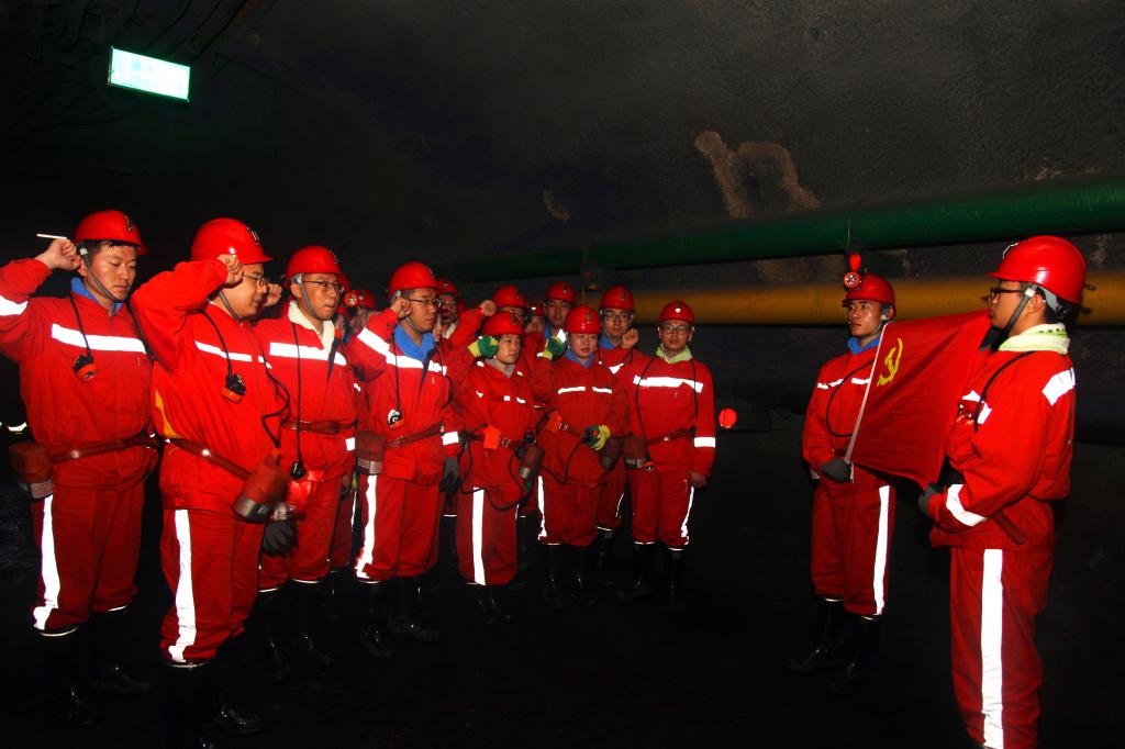 在持续的情感酝酿下,实践队员中党员同志们进行了一场特殊的井下宣誓仪式。仪式结束后,张国林激动地表示:“作为一名共产党员,在各级党组织的领导下,我们对每一项工作都做到严谨、务实,在保证员工生命安全基础上,进一步提高生产效率”。实践队员刘五车感慨道:“以前总是听到父母说煤矿发生安全事故,通过今天对梅花井煤矿的参观学习,我觉得现代化矿井的安全系数非常高,这些技术人员、工人在‘预防为主、防治结合、综合治理’安全生产方针下,能够严格遵守规章制度,保障企业平稳发展。”慕亚龙同学说道:“以前我们对煤矿只停留在表面,今天我们有了深入的了解。工人们在艰难困苦的环境下,依然坚守在自己的岗位上,为祖国的能源事业增砖添瓦,弘扬了大国工匠精神。今天我们面对党旗庄严宣誓,我们一定会珍惜大学时光,努力学好专业知识,以硬本领和高素质投身祖国煤炭事业,像煤一样发光发热。”
