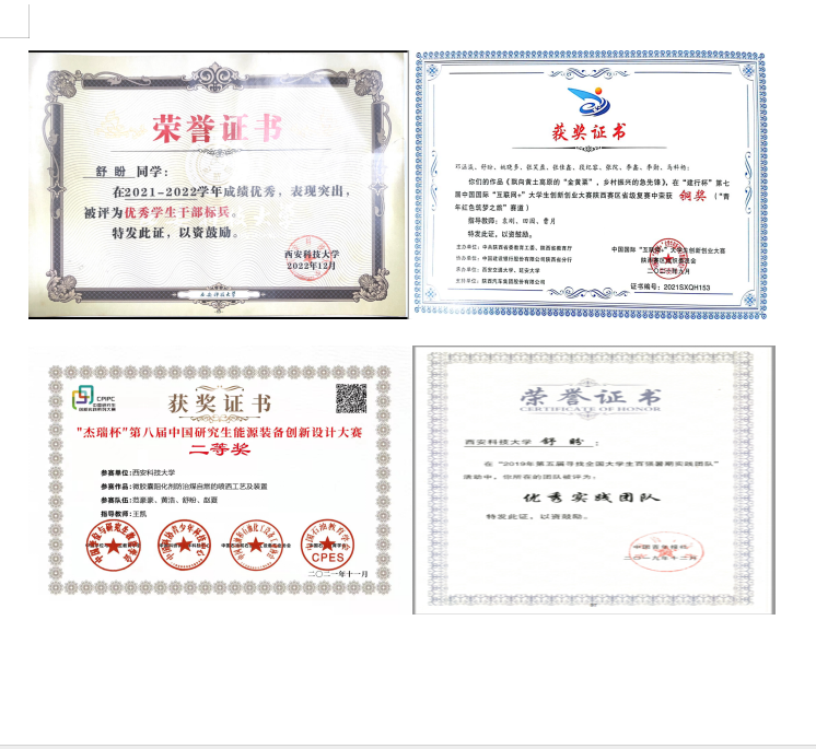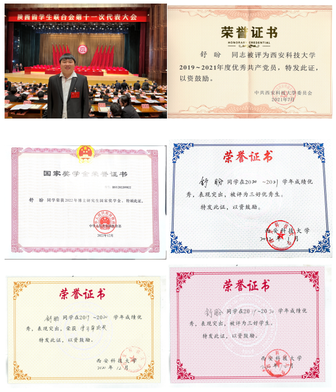 他聚焦主责主业,在成绩上争先进,在挑战自我上实现新突破,认真严谨,刻苦钻研,出色完成研究生各门课程的学习任务,连续三年综合成绩排名专业第一,荣获全国孙越崎优秀学生奖、博士研究生国家奖学金、陕西“晨露”奖学金,以及学校徐精彩奖学金、三好学生、三好优秀学生、学习单项奖等学业奖。