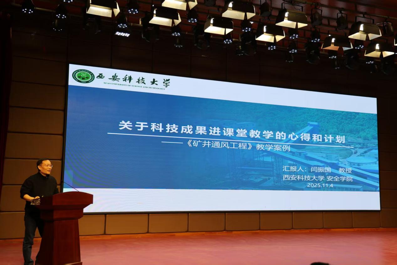 在案例分享环节,中国国际大学生创新大赛(2025)金奖获得者博士研究生刘韩飞分享了参赛项目“煤火智探”如何从课堂理论学习和实验室科研训练中诞生成长的历程,倡议同学们立足学科优势,聚焦行业痛点,在科研实践中培养创新思维与实操能力,为服务国家能源安全与行业创新发展注入青春动能。安全工程系副主任闫振国教授以《矿井通风工程》课程为例,分享了科技成果与课堂教学深度融合的实践经验。他通过重构教材内容、搭建数字孪生平台,借助三维可视化、沙盘模拟、知识图谱等技术,将黄陵矿区等科研项目转化为教学案例,解决传统教学中“工程理解难、实操门槛高”的痛点,实现“教、学、研、用”一体化,生动诠释了科技成果进课堂对学生科研实践能力的深度赋能。