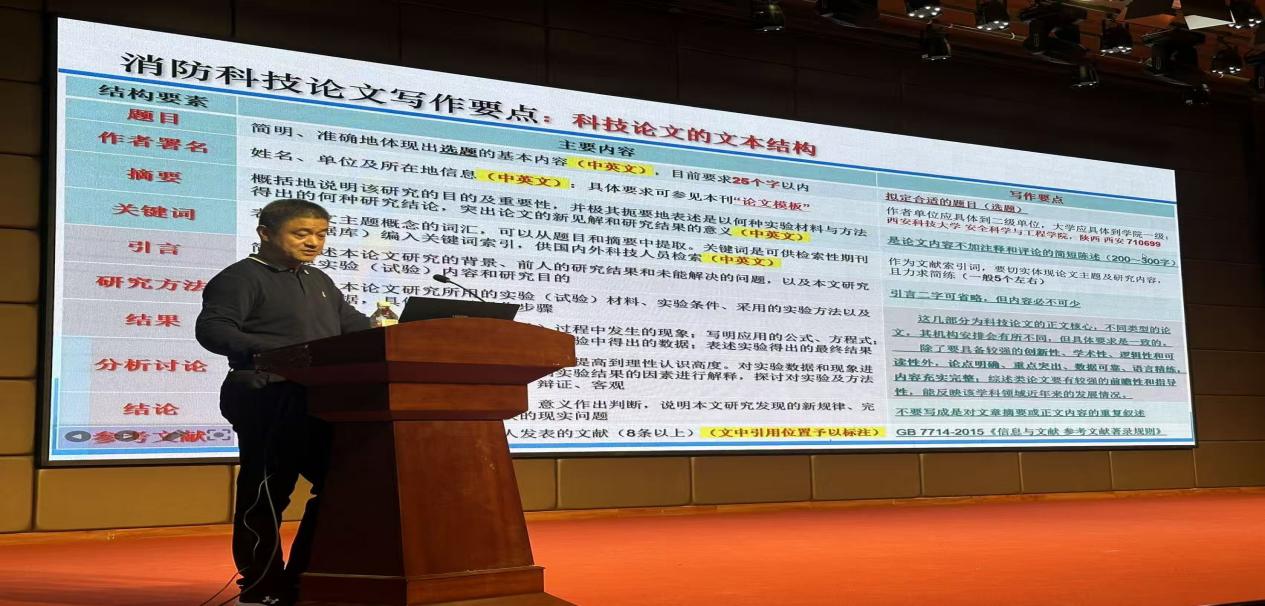 邢玉军以“消防科技论文写作规范及要点”为题,结合自身多年编审经验,围绕消防科技论文的标题、摘要、关键词、引言、正文、结论、参考文献等规范要求,逐一剖析写作要点与常见问题,为在场师生带来了一场内容详实、针对性强的论文写作指导。在交流环节,邢玉军就师生提出的论文选题、数据呈现、审稿流程等问题进行了细致解答,现场气氛热烈。