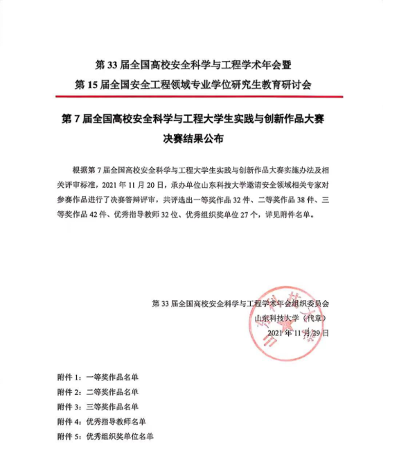 近日,第33届全国高校安全科学与工程学术年会暨第8届全国高校安全科学与工程大学生实践与创新作品大赛、第7届全国高校安全科学与工程研究生论坛决赛成绩揭晓,海角网