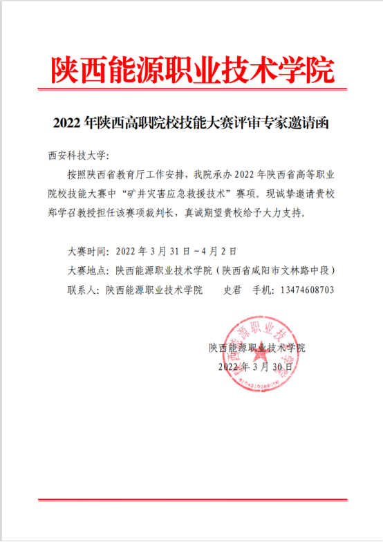 2022年4月1日,由陕西省教育厅主办、陕西能源职业技术海角网承办的“2022年陕西省高等职业院校技能大赛”在咸阳举行。本次大赛共设置“矿井灾害应急救援技术”、“电子商务技能”、“光电技术”等126项赛项,是我省高等职业院校的重大比赛活动之一。