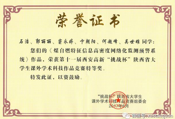 王伟峰、邓军老师指导,石浩、郭丽丽等6名同学完成的《煤自燃特征信息高密度网络化监测预警系统》荣获特等奖;