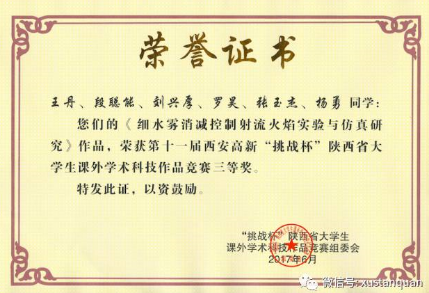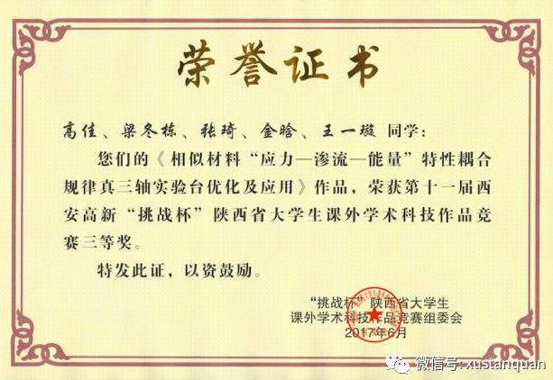 李树刚、赵鹏翔老师指导,高佳、梁冬栋等5名同学完成的《相似材料“应力-渗流-能量”特性耦合规律真三轴实验台优化及应用》和马砺、刘长春老师指导,王丹、刘兴厚等6名同学完成的《细水雾消减控制射流火焰实验与仿真研究》分别荣获三等奖。