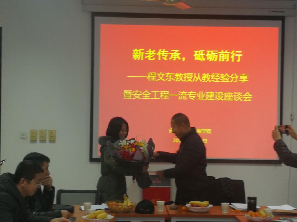 发展的美好祝愿。学生代表安全工程(卓越)1301班的武睿萌同学向程老师献花,表达了感激之情,并送上了自己的祝福。杜勇书记和邓军院长分别向程教授颁发了纪念品和退休慰问金。