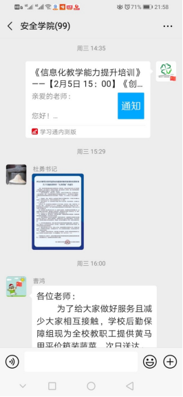 关于2020年春季学期本科教学工作安排的通知》,启动网络教学准备工作,妥善组织安排好任课教师、学生的前期培训和宣传工作,要求任课教师积极做好开设线上课程的准备工作。例如学习“以雨课堂直播为主要特征的混合式教学新模式”“信息化教学能力提升培训”等,已组织所有任课教师利用教育部发布的优质慕课采用SPOC教学模式,或者利用学堂在线、超星、智慧树等课程中心平台自行制作在线课程,同时要求教师通过线上教学和QQ群等形式为学生学习提供保障。
