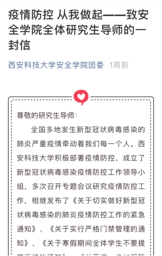 研究生导师的一封信》,要求全体研究生导师以身作则,切实履行研究生培养第一责任人的责任,积极在疫情防控特殊时期为研究生做好假期学习和科学研究提供相应的支持指导。