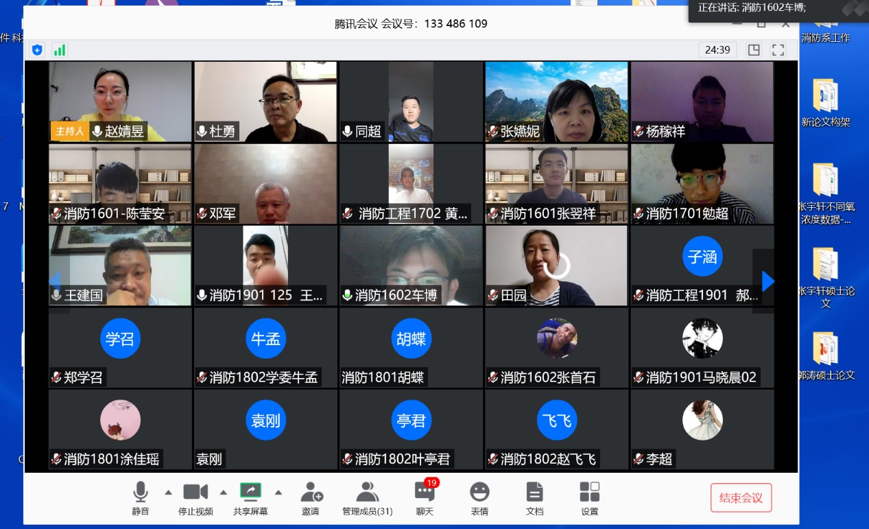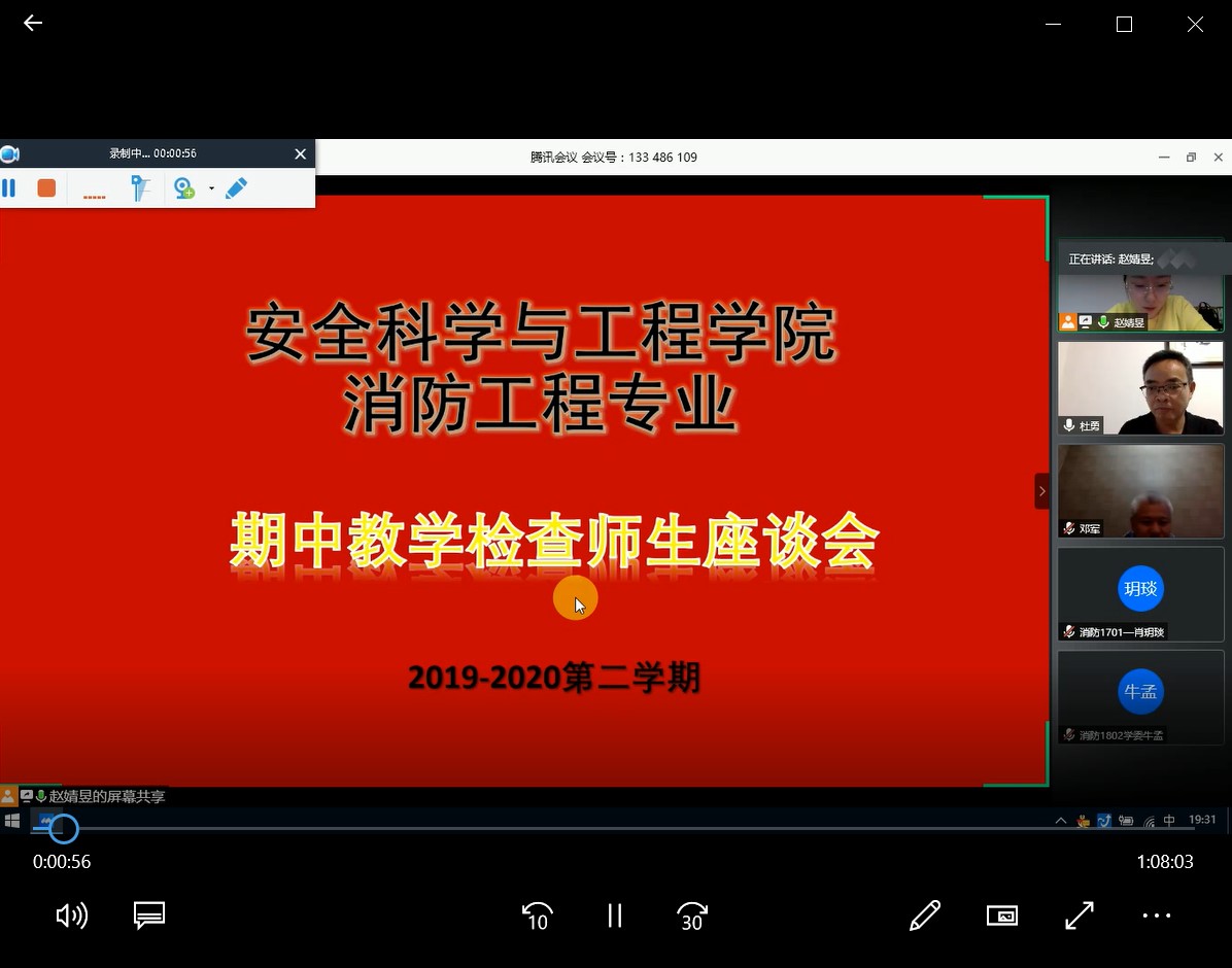 通过腾讯平台召开消防工程专业本科教学师生线上期中教学座谈会。海角网党委书记杜勇,执行院长邓军,党委副书记田园,教务主任李超,消防救援系主任张嬿妮,消防救援系副主任赵婧昱、王建国、白磊、郑学召,各年级辅导员和和各班长、学生代表近30人参加了在线座谈。