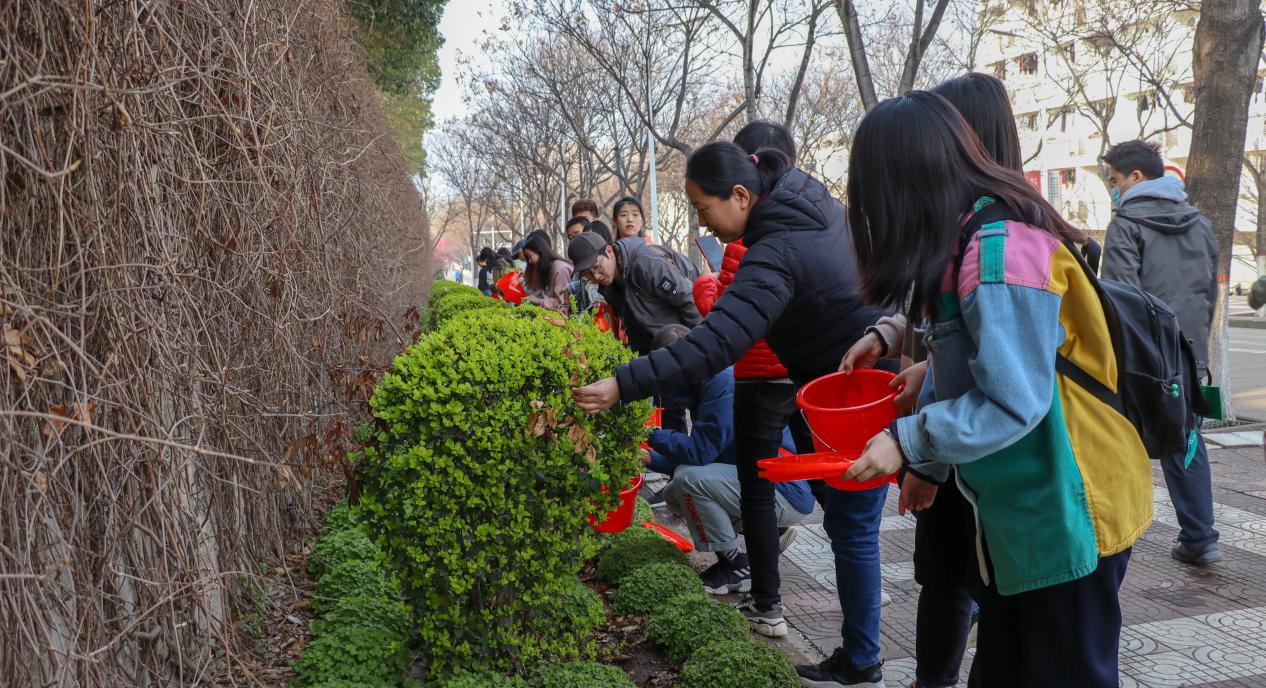 在支部书记的带领下,党员同志们迅速投入到热火朝天的劳动之中,按照划定好的区域进行浇水、捡拾枯枝、清理垃圾,大家忙而不乱,干劲十足,展现了新时代青年的劳动风貌,用实际行动改善校园环境,建设更美好的生活家园。