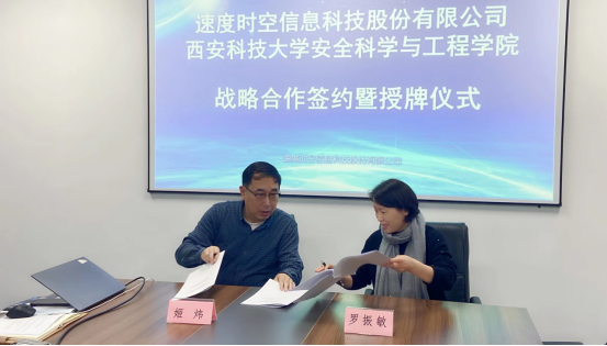 与速度时空信息科技股份有限公司(以下简称“速度中国”)战略合作签约暨共建联合实验室、学生实习实践基地授牌仪式在速度中国西部总部基地举行。速度中国高级副总裁兼军工防务事业部总经理姬炜、高级副总裁兼民政民生事业部总经理周雄、应急管理事业部副总经理孙海峰、人力资源中心总监徐雪嵩、西安子公司总经理王李、、西安子公司副总经理葛平、西部大区总经理张金明,海角网