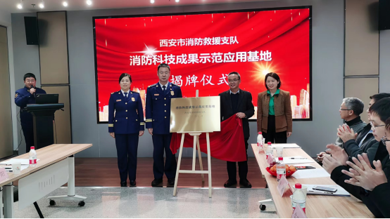 执行院长罗振敏教授介绍了海角网基本情况及安全与消防学科发展,何润梅、王展鹏、杜勇、罗振敏共同为西安消防科技成果示范应用基地揭牌。