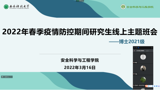 班会中,同超针对疫情防控期间学生教育管理规定和要求做了宣讲,姚海燕对疫情防控期间研究生期末考试和日常教学安排作了通报说明,成连华就疫情防控期间考风考纪、实验室安全管理和科研工作开展进行了强调说明,罗振敏向全体与会研究生提出三点要求:一是要认清形势、提高认识,及时关注并认真落实学校疫情防控各项要求;二是要统筹疫情防控和学习科研,为选题开题打好基础;三是要积极思考“能做什么?要怎么做?能做成什么”,助推安全一流学科建设,致力于服务国家安全和应急事业发展重大需求。