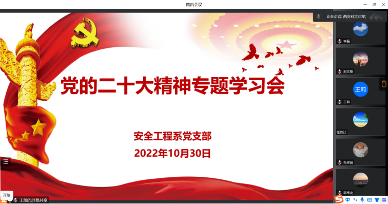 安全工程系党支部线上召开党员大会,专题学习党的二十大精神。会议由党支部副书记王凯主持。校党委委员、副校长、党支部书记邓军参加了支部学习。