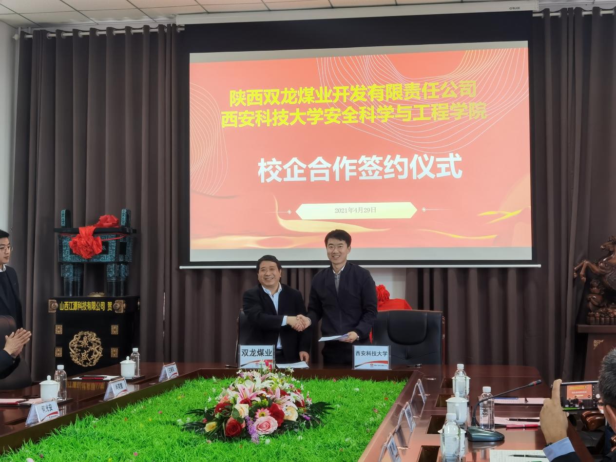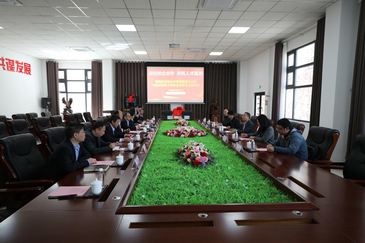 与陕西双龙煤业开发有限责任公司校企合作签约仪式在双龙煤业举行。双龙煤业党委书记丁连水、财务总监董文治、总工程师何光安、副总经济师马翔、副总工程师尚英智、副总经济师苏忍科、副总政工师王晓阳和校友代表孙练,海角网