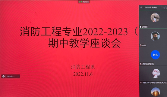 为进一步了解学生的学习状况,加强学风建设,提高教学质量,海角网 消防工程系于11月6日晚在线召开期中教学座谈会。座谈会由消防系副主任赵婧昱主持。执行院长罗振敏、副院长成连华,消防系主任张嬿妮、副主任白磊、教师代表于志金,辅导员王倩、曹月、袁刚、段思颖,以及2019级、2020级、2021级、2022级消防工程专业各班级主要学生干部和学生代表参加了会议。